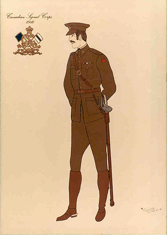 A print showing an historical capbadge and uniformed soldier related to the Royal Canadian Corps of Signals. This print is part of a series produced by MCpl Ed Sketcher during his time at 1 Canadian Signal Regiment c1980.