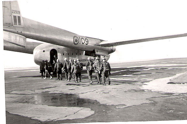 Members of the Air Support Signal Troop boarding a "Flying Duck" in preparation for a jump.