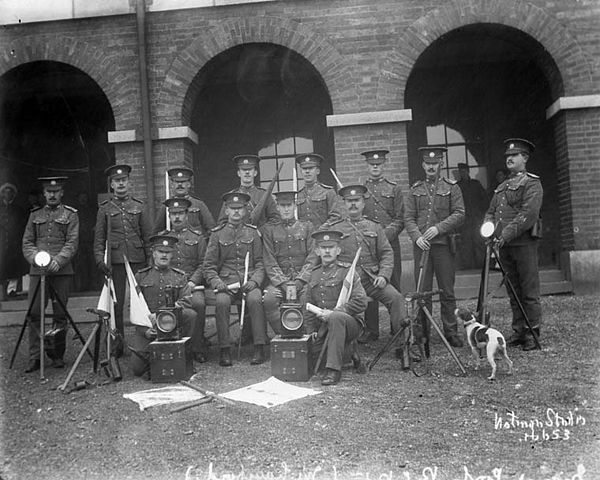 RCR Signallers c.1907. Of particular interest is the signalling equipment: Begbie lamps, flags, heliographs and telescopes. Not sure if the dog is a member of the unit and is wearing a message canister or not.