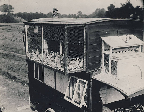 Pigeon coop lorry with birds. Photo appears to be a portion of this photo: Pigeons in the loft of their lorry-home November 1917.jpg