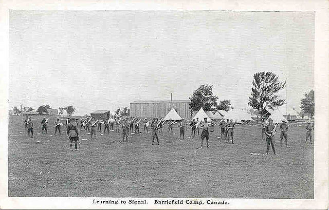 Photo postcard titled "Learning to Signal Barriefield Camp Canada"