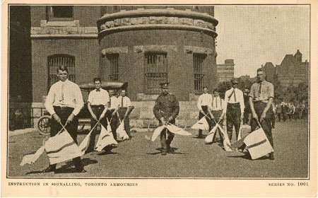 Photo postcard bearing the title "Instruction in Signalling - Toronto Armouries".