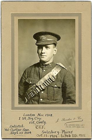 Photo of Private C.M. Sprague, MM, a member of 1st Canadian Divisional Signal Company, taken at London in November 1914. In the margins, he gives details of his service prior to proceeding to France.