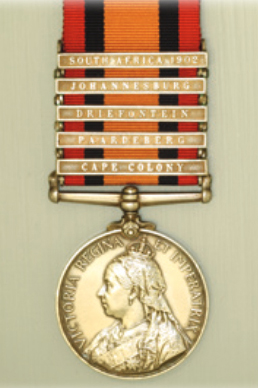 The Queen's South Africa Medal awarded to Major Bruce Carruthers. He was entitled to five bars: CAPE COLONY; PAARDEBERG; DRIEFONTEIN; JOHANNESBURG; and SOUTH AFRICA 1902.