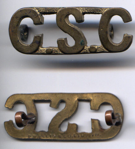 A metal shoulder title for the Canadian Signal Corps. This title was used in 1921 replacing the "words in full" title but was quickly replaced with the RCCS version when the Royal prefix was granted. This example is marked "P.W. ELLIS & CO. LTD. 1921".
