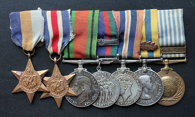 The medals are (left to right): 1939-1945 Star, France and Germany Star, Defence Medal, Canadian Volunteer Service Medal with overseas bar, 1939-45 War Medal, Korea Medal (Canadian) with Mentioned in Despatches oakleaf, United Nations Service Medal (Korea)