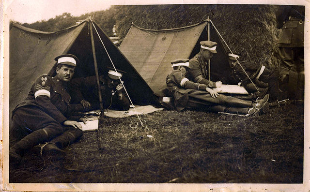Signallers during the Great War. Believed to be during training in England. The purpose of the white bands on the hats is not clear. Note the use of both the grenade and the signal flag devices above the sergeant's chevrons.