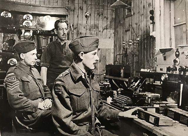 Photo of Capt W.H.T. Wilson, section commander of "K" Section, 1 Canadian Divisional Signals, Sergt R.L. Halling (not identified but the nominal roll only lists one Sergt) and an unidentified member of the Signal Section in an occupied wireless station during the Spitzbergen Raid, Aug/Sep 1941.