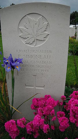 Grave marker for Simoneau, Paul in Beny-sur-Mer Canadian War Cemetery.