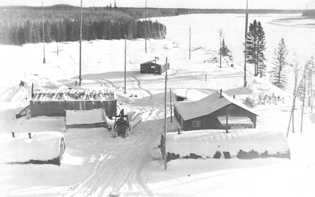 Embarras Station during an unidentified winter. The quonset hut is the Sigs living quarters and the station building is the last, just beyond.
