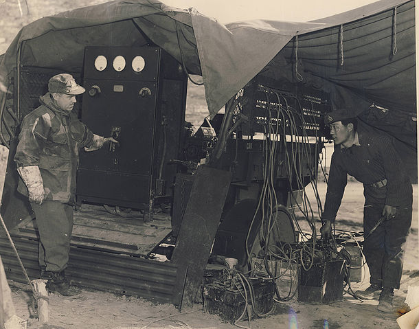 Lineman LCpl A.R. McLeod and his Korean assistant stringing cable.