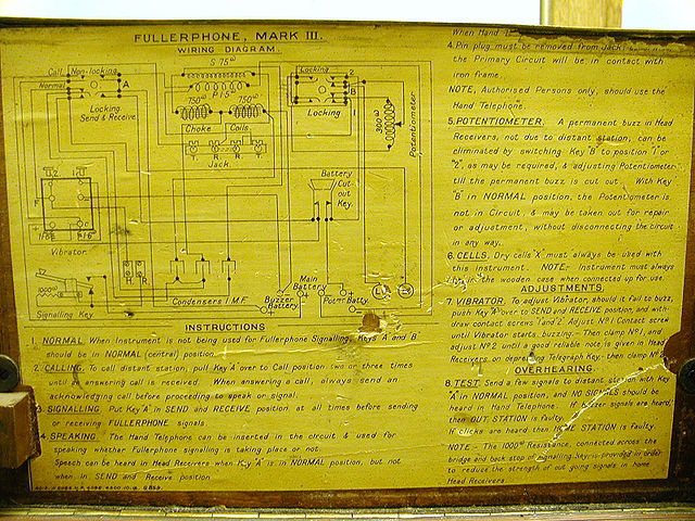 Photo of a Fullerphone Mk III schematic and instructions as they appear on the inside of the lid.