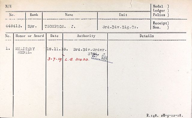 Thompson, Joseph medal card MM