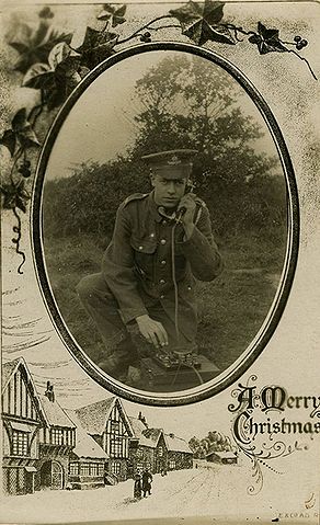 An undated Christmas card. Card shows a staged photo of a British soldier using a Transmitter, vibrating with a handset Telephone, Hand, A.