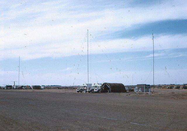 (73 Canadian Signal Squadron) Three AN/GRC142 detachments and assorted antennae provide rear link communications. The large 60 foot tower is part of the newly constructed sloping-vee on the Ismailia-Lahr circuit.