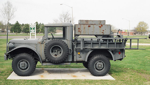 Left side view of a M37Cdn 3/4 Ton Line vehicle. This example is located at CFB Gagetown and, unfortunately, it is in need of a little TLC.