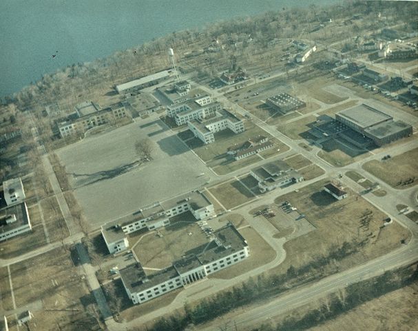 An aerial photo of Vimy Barracks taken either late fall 1966 or early 1967. Visible is the Vimy parade square and buildings B1, B2, the Forde Building and Vimy WO & Sgts Mess.