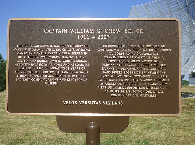 A photo of the William G. Chew Circle plaque in front of the Military Communications and Electronics Museum.
