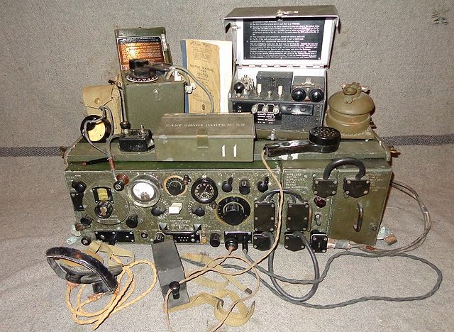 A photo of a complete Wireless Set No. 11 set including ancillary equipment. Items shown include a Wireless Remote Control Unit A and a Aerial Coupling Equipment C.