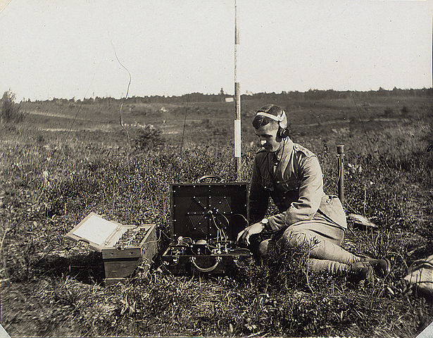 Photograph captioned "Eric Costin and wireless Telegraph apparatus. Transmitting. 29/8/11". Series of photos indicate the photo was taken at Camp Petawawa.