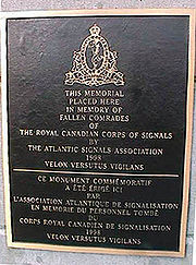 The Signals memorial plaque reads:This Memorial placed here in memory of fallen comrades of the Royal Canadian Corps of Signals by the Atlantic Signals Association 1998. VELOX VERSUTUS VIGILANS