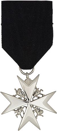 The insignia of a Knight or Dame of Justice or of Grace consists of a breast star and a neck badge. The breast star is 76mm across, set in gold, without embellishments for Justice and in silver, with embellishments, for Grace, all enamelled white. The neck badge is the cross of the Order, 45mm across, with embellishments, set in gold for Justice and silver for Grace, enameled white.