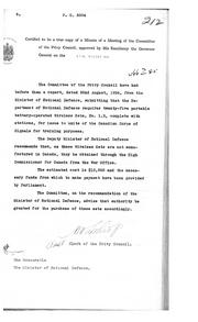 The Deputy Minister of National Defence recommends that, as these Wireless Sets are not manufactured in Canada, they be obtained through the High Commissioner for Canada from the War Office.