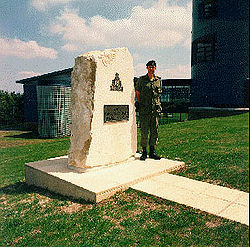 In July 1997, the very kind permission was given to move the Cairn from its location at the back of Roosevelt Gardens to a very prominent position on Hawke Parade Square, beside the Royal Signal Corps Memorial. Initial attempts to transport the Cairn failed due to its design and weakening of the structure over time. The decision was then made by the Canadian Exchange Officer, Major Paul Rutherford, to proceed with the construction of a new cairn from Portland stone - a stone which comes from Dorset and in fact, used in the construction of Buckingham Palace. The accoutrements of the original Cairn were then affixed. This work was accomplished with funding from The Signaller's Club of Canada, the Communications and Electronics Branch, the Communications and Electronics Association, and 11 Signal Regiment of the Royal School of Signals. On 8 November a ceremony was held for the rededication of the Canadian Cairn in its new location on Hawke Parade Square. The ceremony, organized by the new Canadian Exchange Officer, Major Jeff Drummond, was attended by the Branch Leader, Brigadier-General W.S. Richard, a number of Canadian veterans now living in England and several serving and retired signallers from Canada.