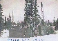 In the summer of 1942, we were sent to Goose Bay, in Labrador. Goose Bay, at that time, was a wilderness with a dirt air strip. We were there because "Axis Sally" had announced, in one of her broadcasts, that a German submarine would land a raiding party to destroy the new U.S. Air Force staging area at Goose Bay. A German "wolf pack" of submarines did destroy most of the convoy of the ships bringing in our supplies, including our living quarters. We lived in tents right through the winter of 1942/43. We spent all our time getting comfortable. Four men to a tent, dug down about four feet and lined with scrap lumber from a sawmill. A load of tent floors came in and these were used to roof over the tents. Stoves were made from empty 45-gallon fuel drums. Stove pipes were made from tomato cans.The U.S. Airforce would fly in convoys of aircraft from Presque Isle, Maine. One Flying Fortress bomber containing a navigator and accompanied by a flight of P38 fighter planes. The planes would be precisely lined up on the runway, straight as an arrow. After refueling in the morning, they would continue to England via Iceland. If the weather was bad over the North Atlantic the planes would be routed to England via Dakar in French West Africa.