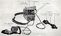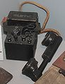 The telescoping hand-set is closed and its flexible lead is wound lengthways round the receiver and microphone. The separate head reciever is then placed against the microphone of the hand set and the two are placed into the smaller of the two leather compartments.