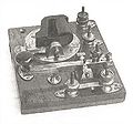 The magnet cores are composed of split tubes of soft iron, packed with charcoal iron wire. The yoke is of soft iron, secured to the cores by two No. 4 B.A. iron screws. The bobbins are formed by fixing ebonite cheeks to the ends of the cores, the latter being insulated with paper and shellac varnish. The coils are wound with double silk covered copper wire, •0108 inch in diameter (No. 32 S.W.G.), soaked in paraffin before winding. The coils are wound so as to produce opposite poles at the free ends of the magnet limbs. Each bobbin is wound to a resistance of 20 ohms ; the inner ends are soldered to the cores, and the outer ends are led to the terminal marked " T.B." ; the two coils are thus connected in parallel and have a combined resistance of 10 ohms. The coils are jacketed with sheet ebonite. The armature is of spring steel with a brass block fixed at the free end. The contacts are platinum. Two adjusting pins are provided, which, when not in use, are screwed into holes provided in the base. The knob of the key can be removed and screwed into the base, for convenience of packing. The instrument, when properly adjusted, should produce a sharp and distinct sound when a current from one Leclanche cell (resistance 2 ohms) is passed through the coils, and should work without change of adjustment with a current from 10 such cells.
